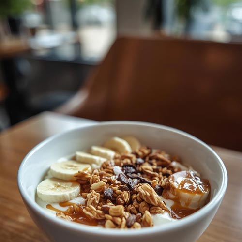The base is 200 g of plain Greek yoghurt, chosen for protein and satiety. Over that sits 40 g of low-sugar roasted almond crunch granola, which delivers lasting crunch and roasted-nut depth. The toppings are sliced banana, a very light drizzle of salted caramel sauce, cacao nibs in place of chocolate chips, and a tiny pinch of sea salt to sharpen the overall flavour.